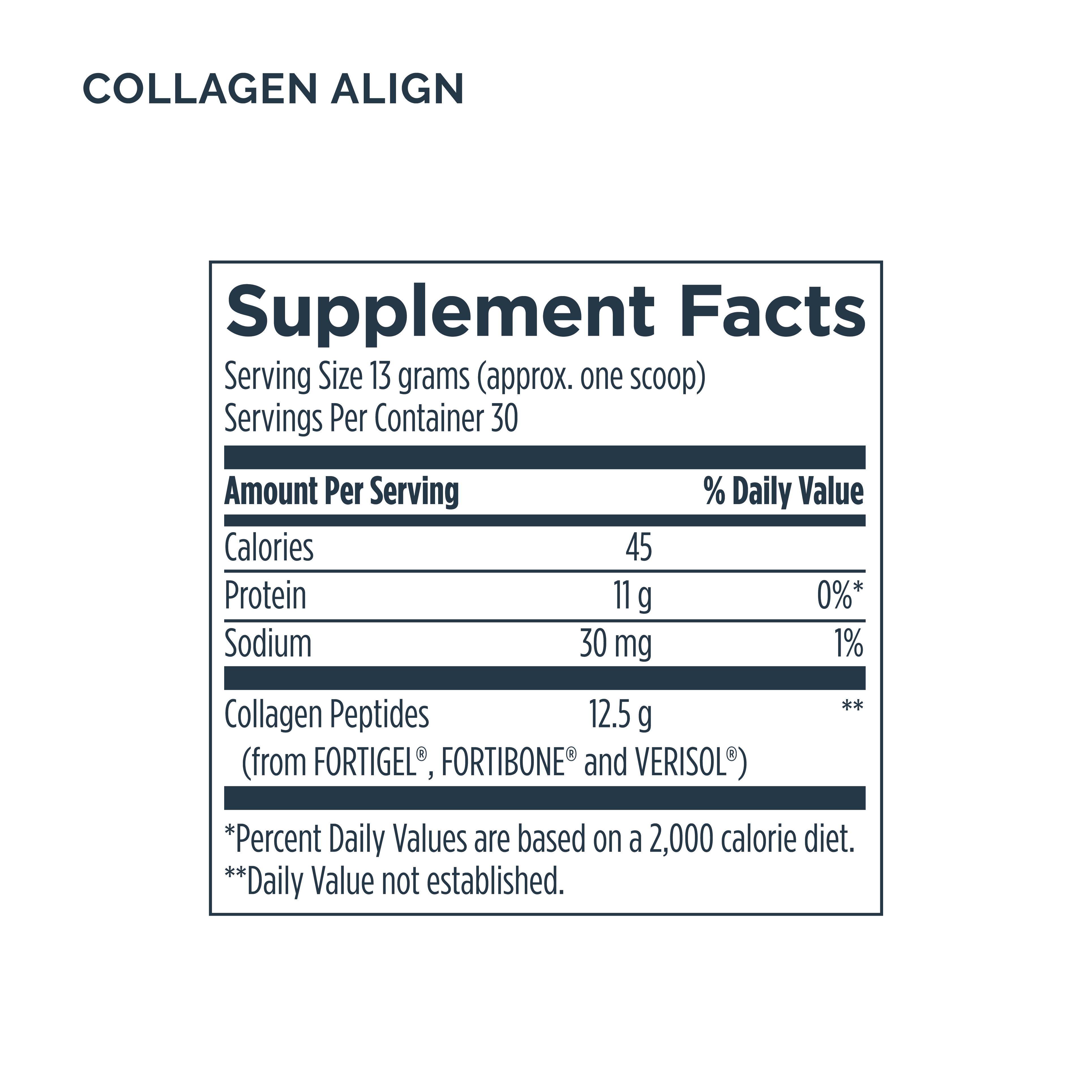 Collagen Align contains a unique blend of 3 patented collagen peptides supported by clinical research to support bone strength, joint health, skin elasticity, and more. Collagen makes up 30% of the body’s total protein and is crucial for maintaining the health of the bones, muscles, joints, skin, nails, and digestive tract. This unflavored powder can easily dissolve in coffee, tea, soups, shakes, or smoothies for everyday convenience to ensure the body has enough raw materials to continually renew and rebuild.