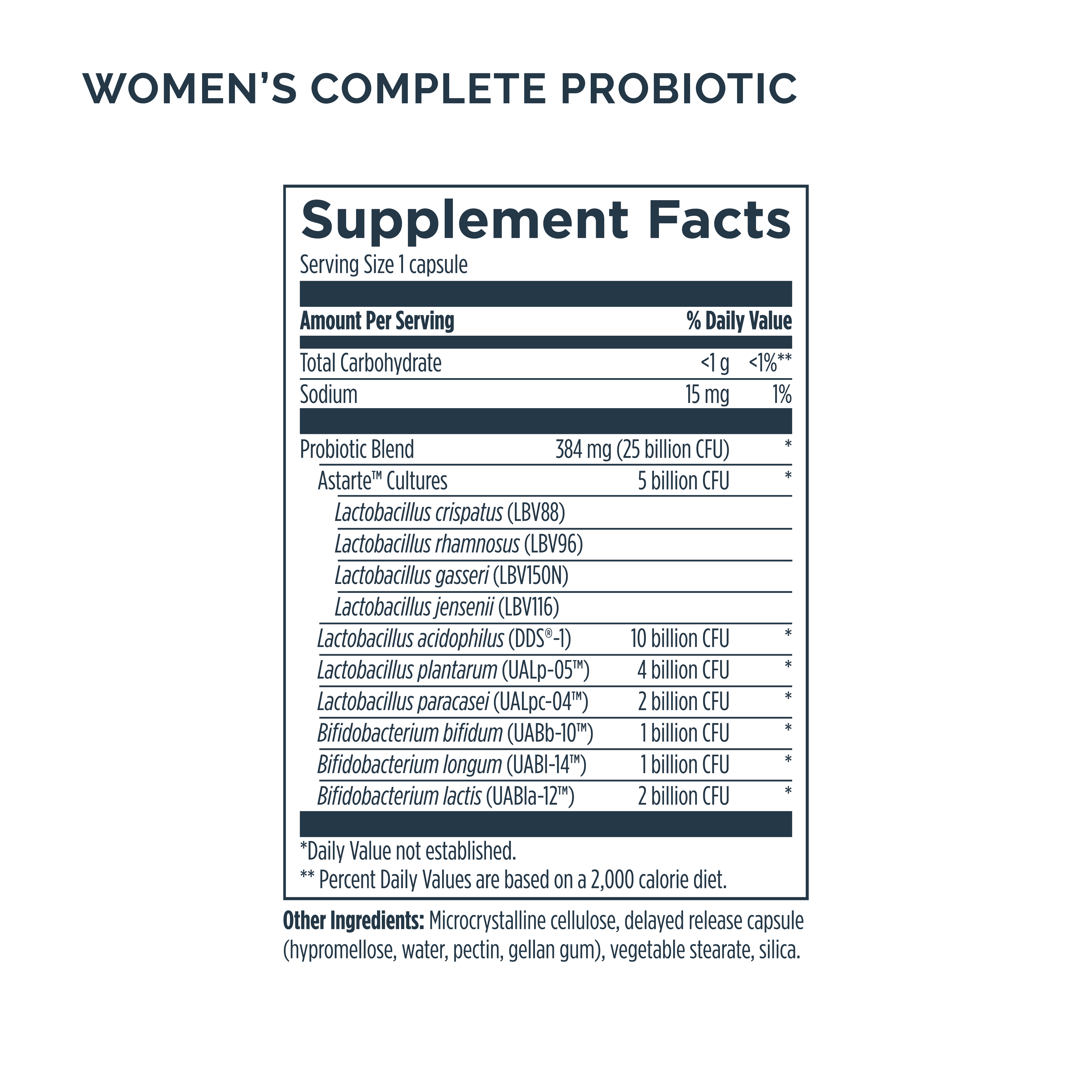 Women’s Complete Probiotic delivers a potent, clinically relevant blend of 10 probiotic strains—including key species from Lactobacillus and Bifidobacterium—to nourish a healthy vaginal and gastrointestinal microbiome. Each capsule provides 25 billion CFUs to help restore microbial balance, support optimal gut function, and maintain vaginal health and comfort.